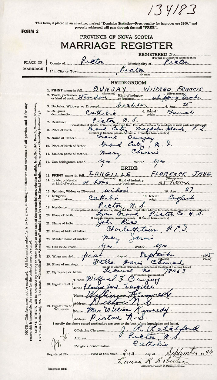 26. Place of marriage Stella Maris Church Pictou, Pictou County