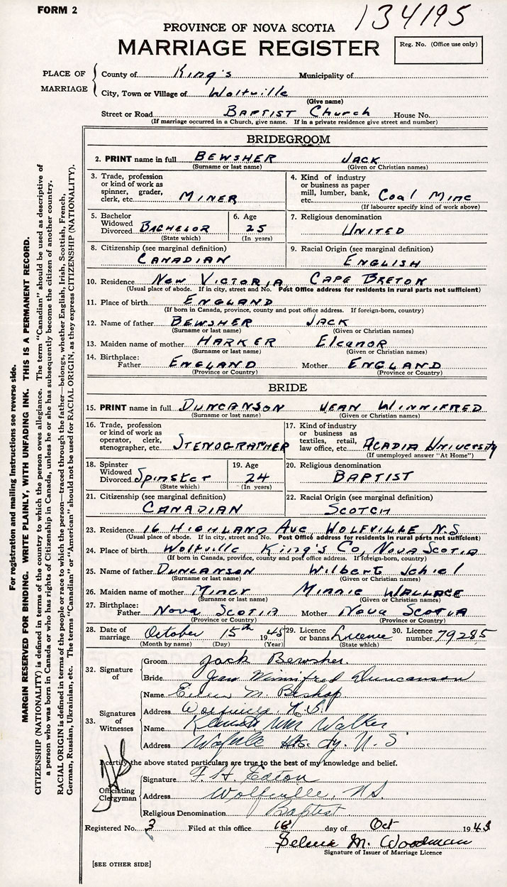 5. Religious denomination United Church of Canada 6. Racial origin English