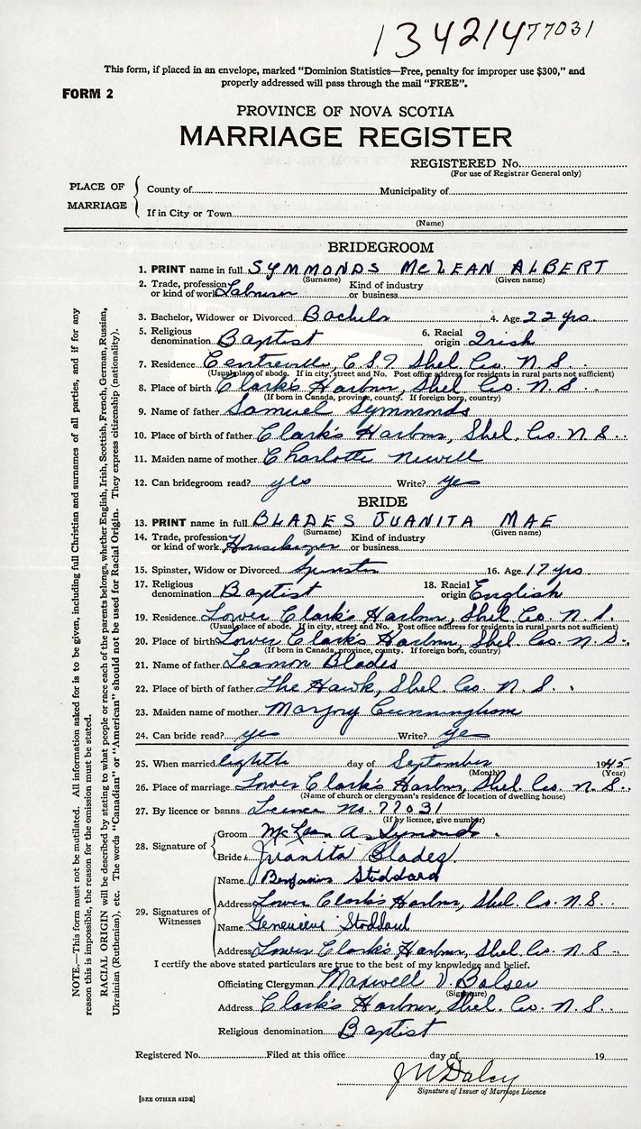 26. Place of marriage Lower Clark's Harbour, Shelburne County
