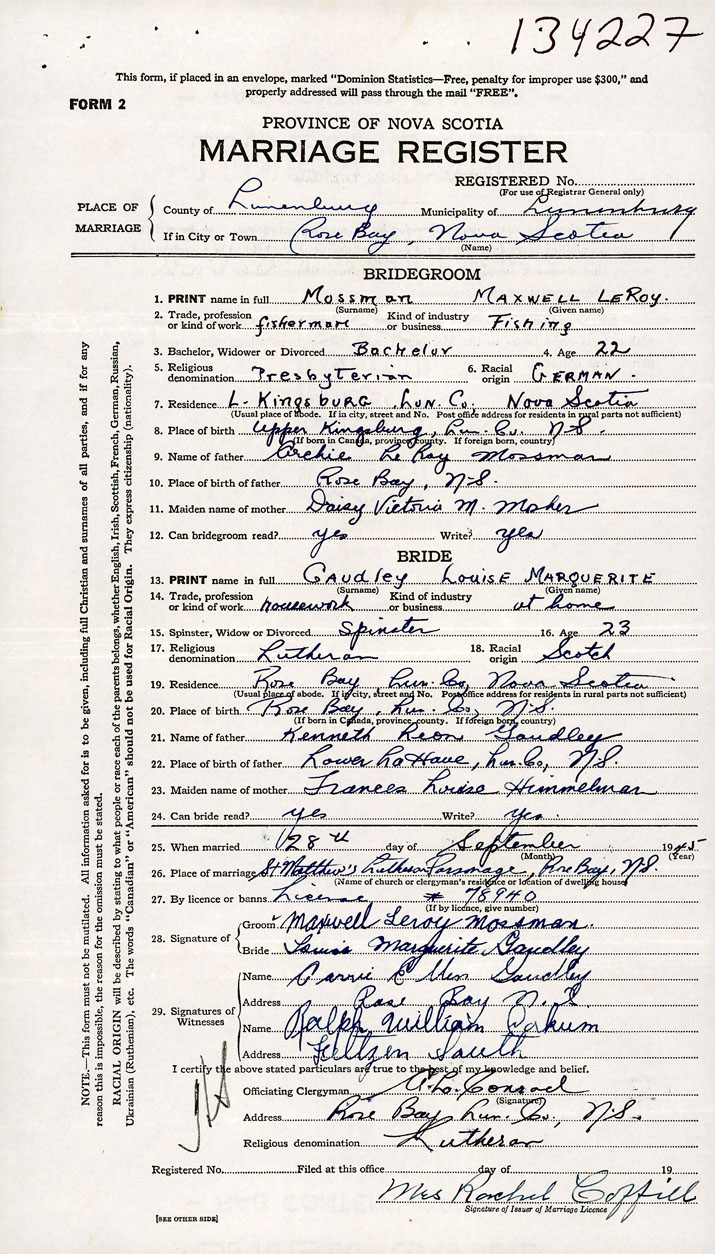 PLACE OF MARRIAGE County of Lunenburg in City or Town Rose Bay