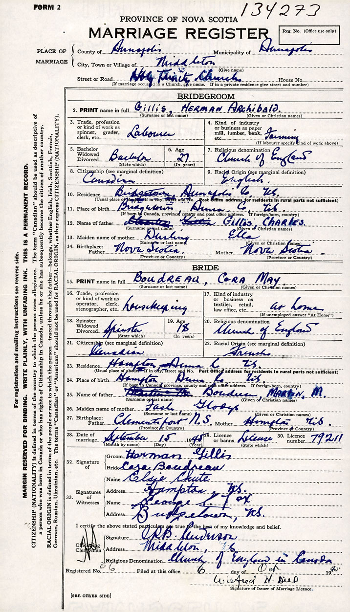 Groom Herman Archibald Gillis