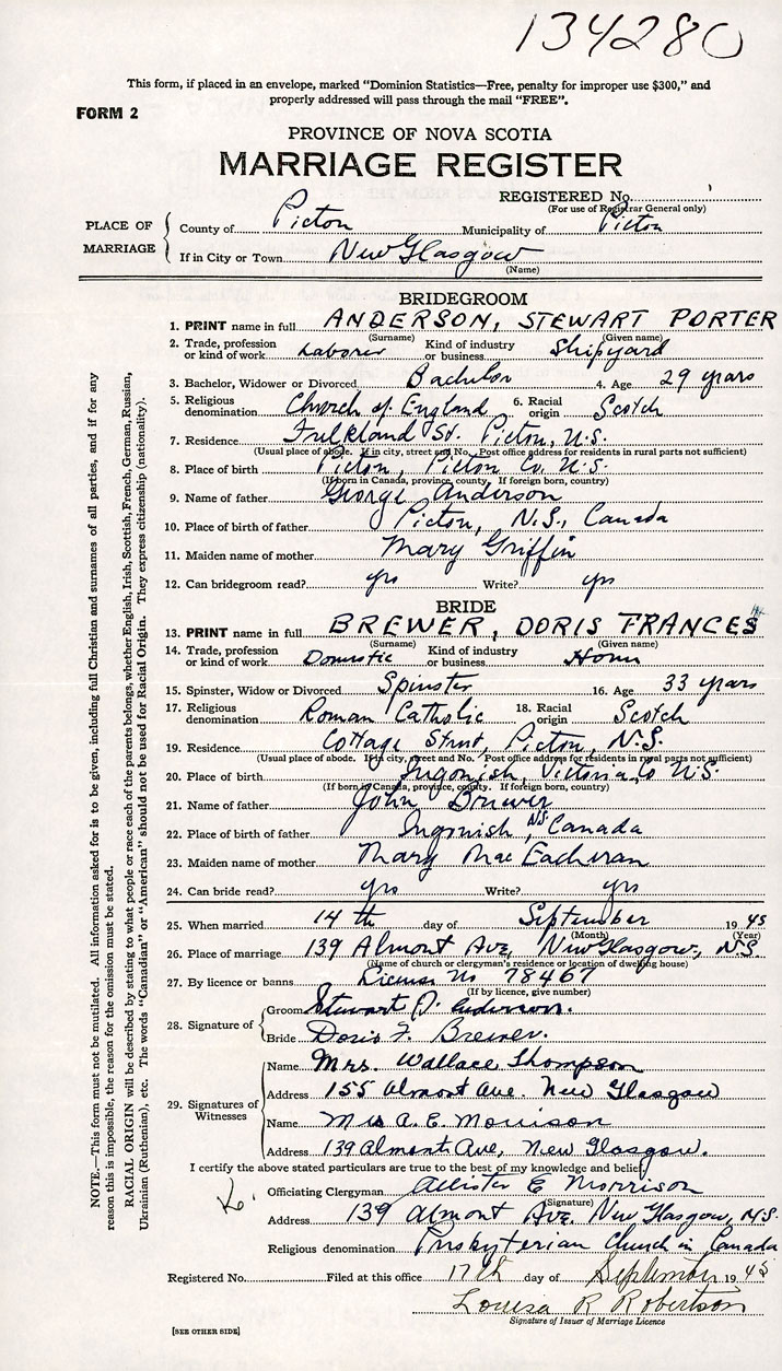 26. Place of marriage 139 Almont Ave New Glasgow , Pictou County