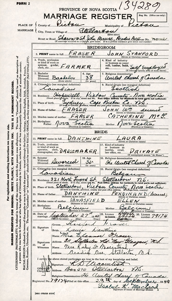PLACE OF MARRIAGE County of Pictou in City or Town Stellarton