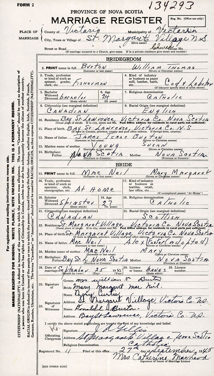 22. Place of birth of father Bay St. Lawrence, Nova Scotia