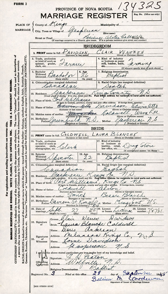 26. Place of marriage Residence Alston Caldwell Gaspereau, Kings County