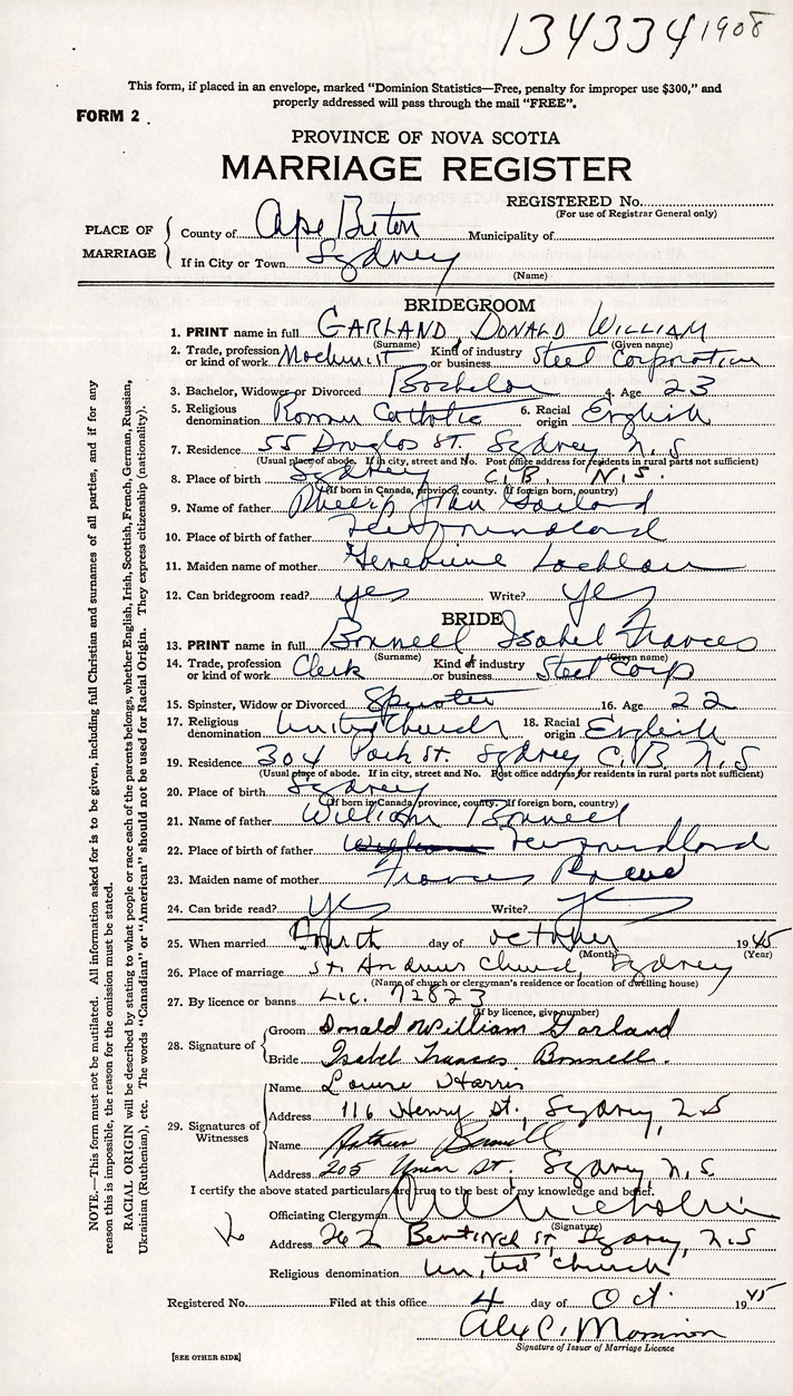 26. Place of marriage St.. Andrew's church Sydney, Cape Breton County