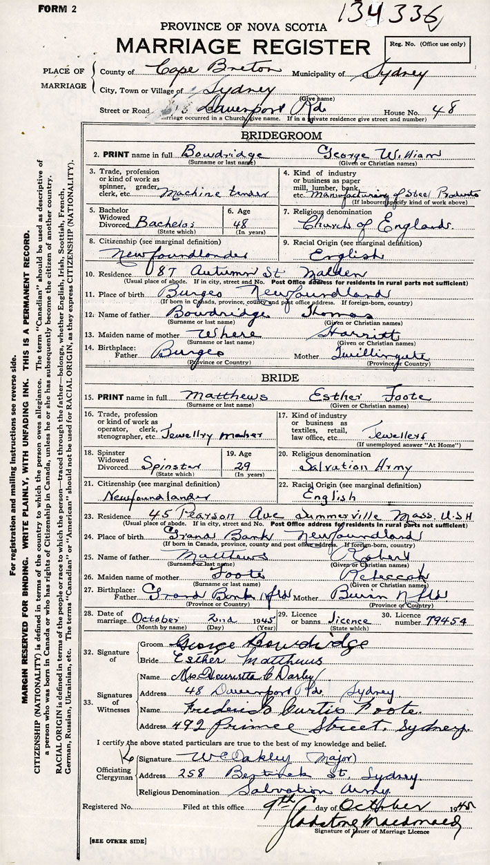 Note: Groom's mother born Twillingate [Newfoundland]; bride's mother born Burin, Newfoundland