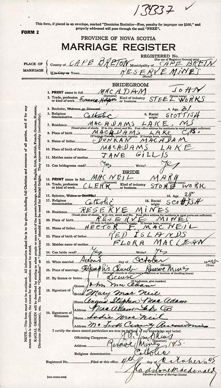 PLACE OF MARRIAGE County of Cape Breton in City or Town Reserve Mines