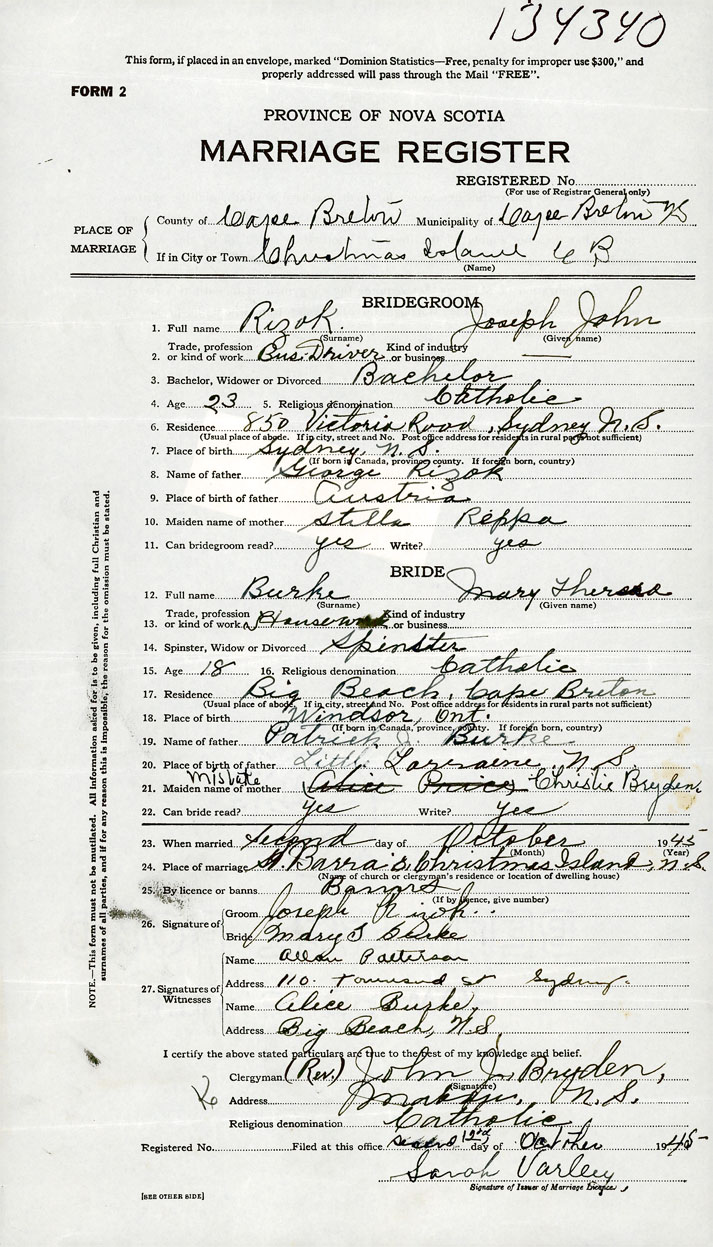 26. Place of marriage St. Barra's Christmas Island, Cape Breton County