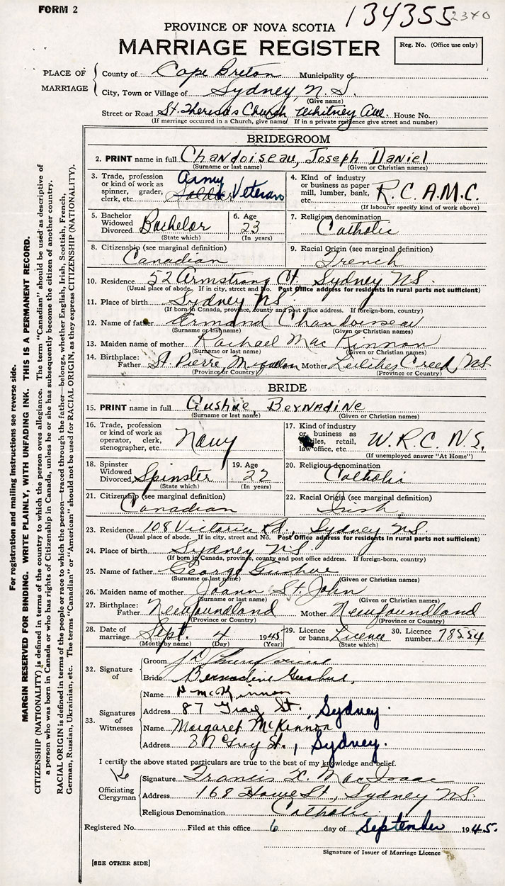 PLACE OF MARRIAGE County of Cape Breton in City or Town Sydney