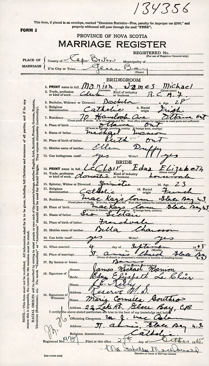 26. Place of marriage St. Anne's Church Glace Bay, Cape Breton County