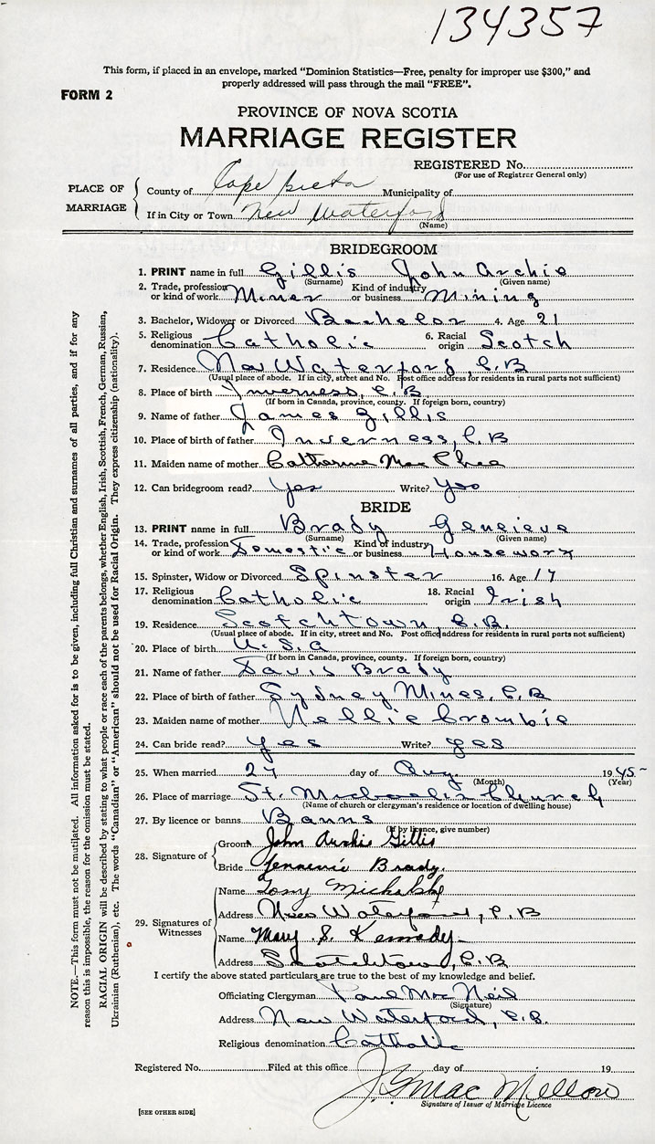 PLACE OF MARRIAGE County of Cape Breton in City or Town New Waterford