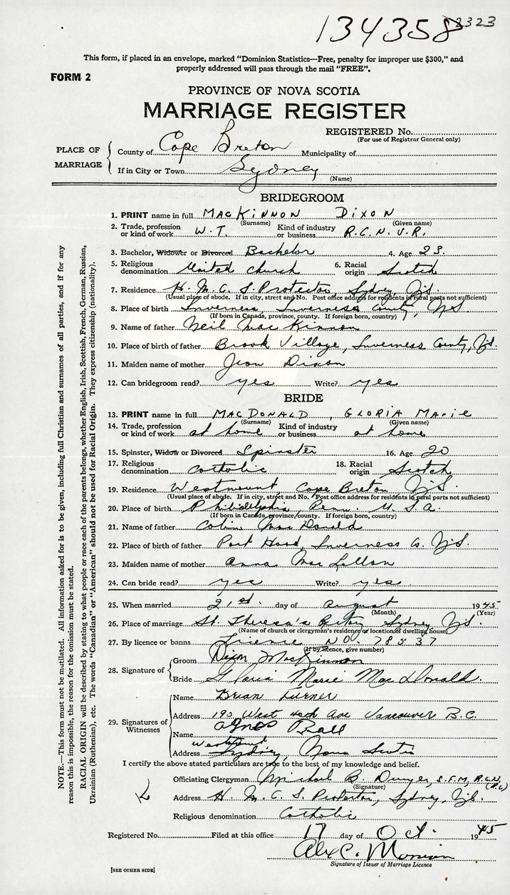 PLACE OF MARRIAGE County of Cape Breton in City or Town Sydney