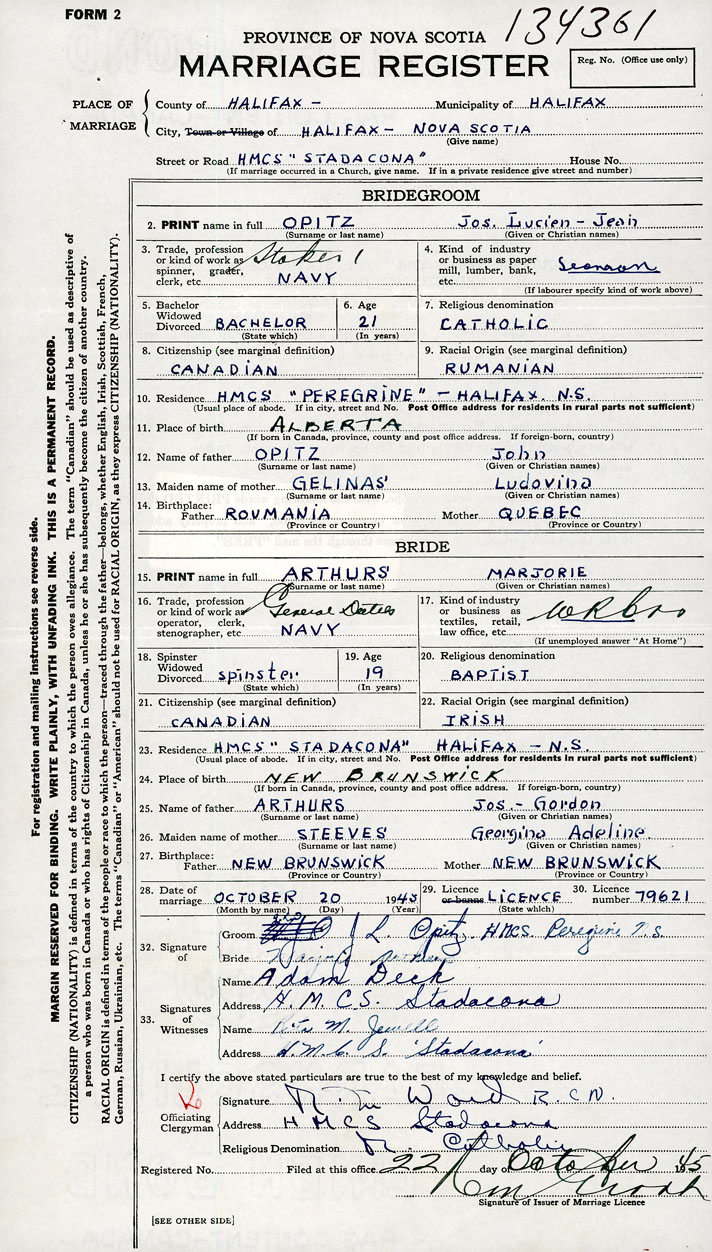 26. Place of marriage HMCS Stadacona Halifax, Halifax County