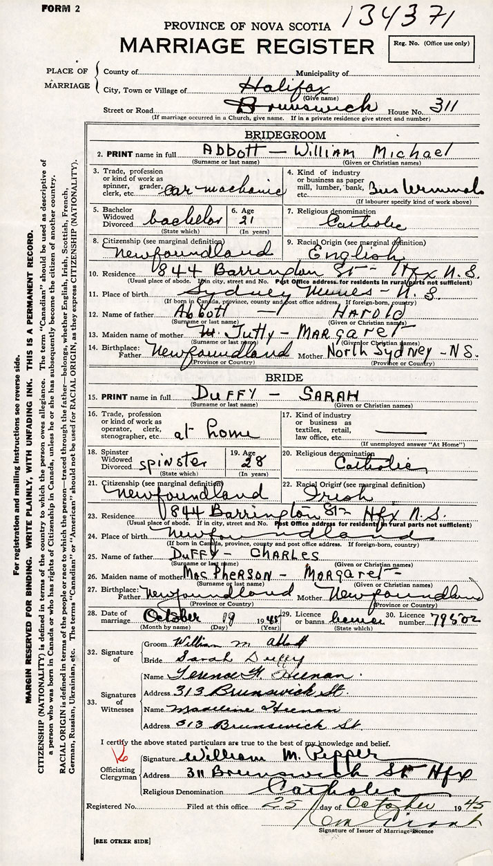 26. Place of marriage Brunswick St Halifax , Halifax County