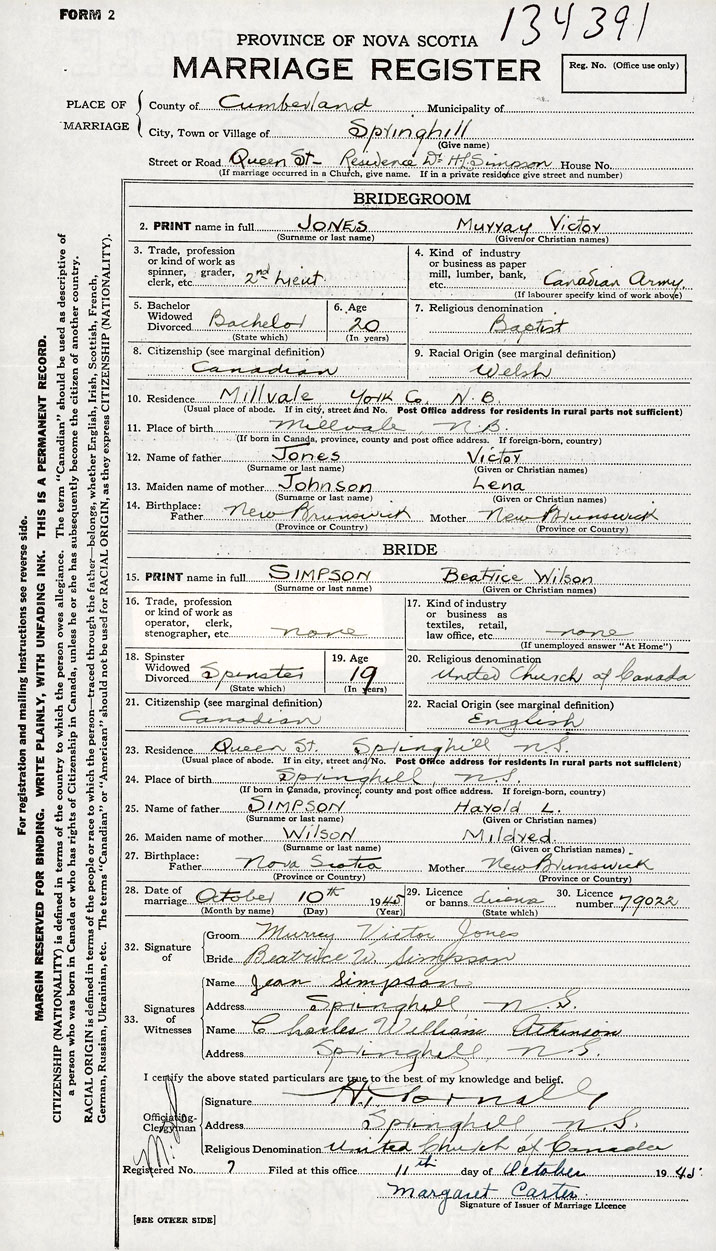 PLACE OF MARRIAGE County of Cumberland in City or Town Springhill