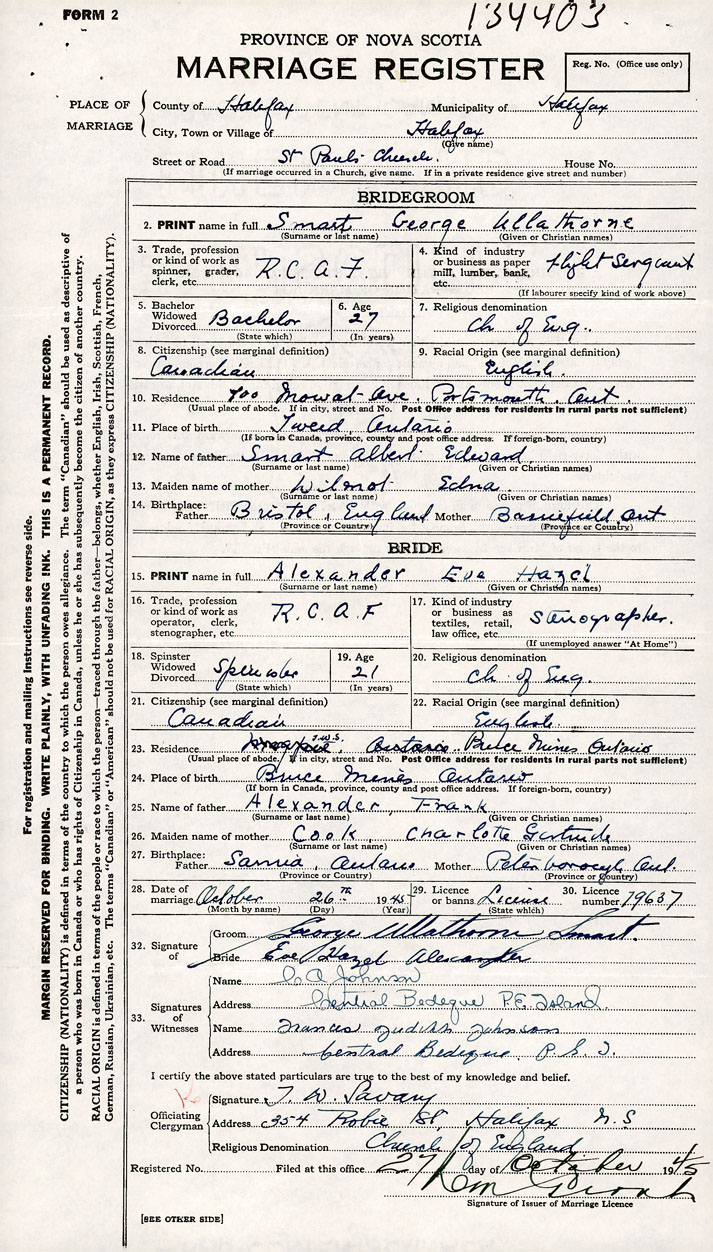 According to a certified copy of the Decree Absolute for Divorce dated 1974-8-19 and filed in the Office of the Registrar General under Divorce number 74-02-002002, it is ordered that the marriage of George Allathorne Smart and Eva Hazel Alexander (Registered under marriage number 1945-134403) be null and void.