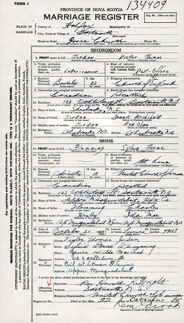 26. Place of marriage Grace Church Dartmouth, Halifax County