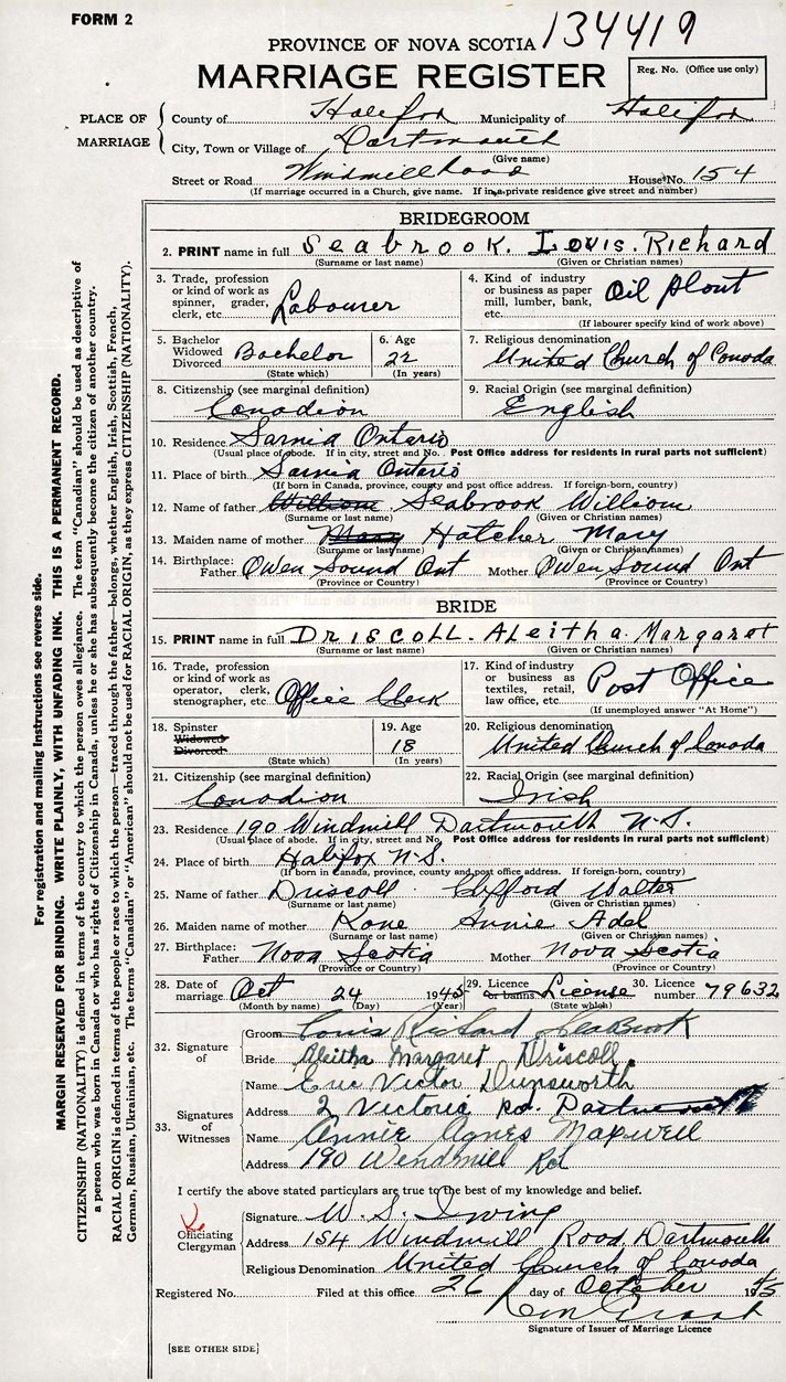 26. Place of marriage 154 Windmill Road Dartmouth, Halifax County
