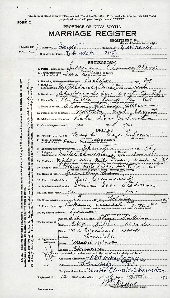 According to a certified copy of the Decree Absolute for Divorce dated 1973-9-28 and filed in the Office of the Registrar General under Divorce number 73-02-002005, it is ordered that the marriage of Clarence Alonzo Sullivan and Eliza Eileen Woods (Registered under marriage number 1945-134430) be null and void.