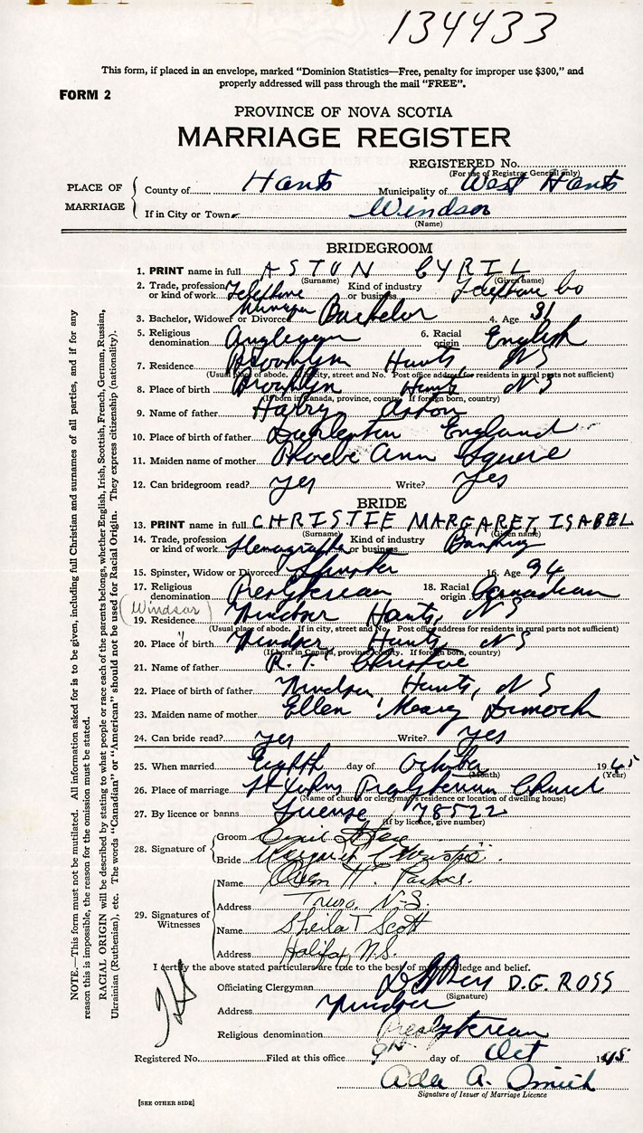 26. Place of marriage St. John's Presbyterian Church Windsor, Hants County
