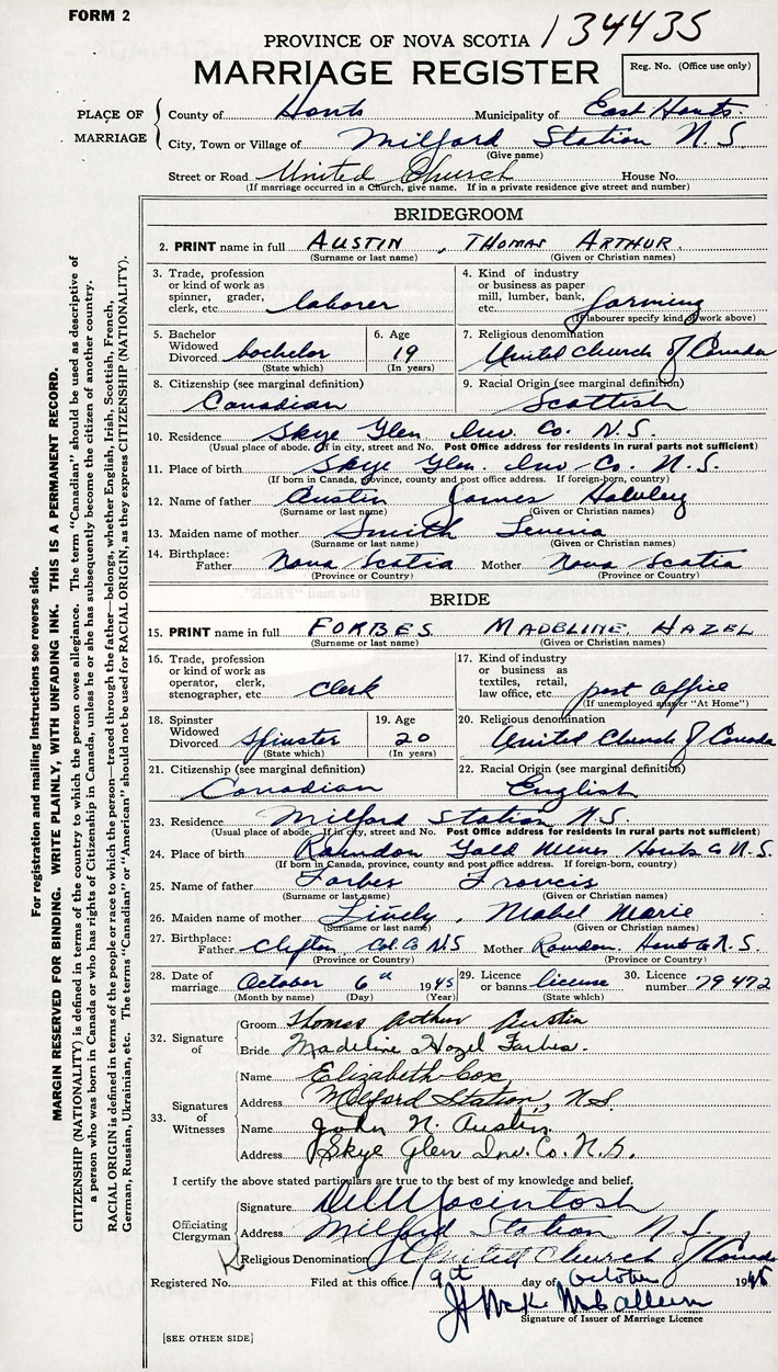 26. Place of marriage United Church of Canada Milford Station, Hants County