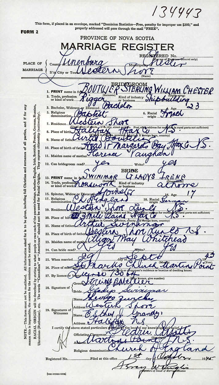 PLACE OF MARRIAGE County of Lunenburg in City or Town Martin Point