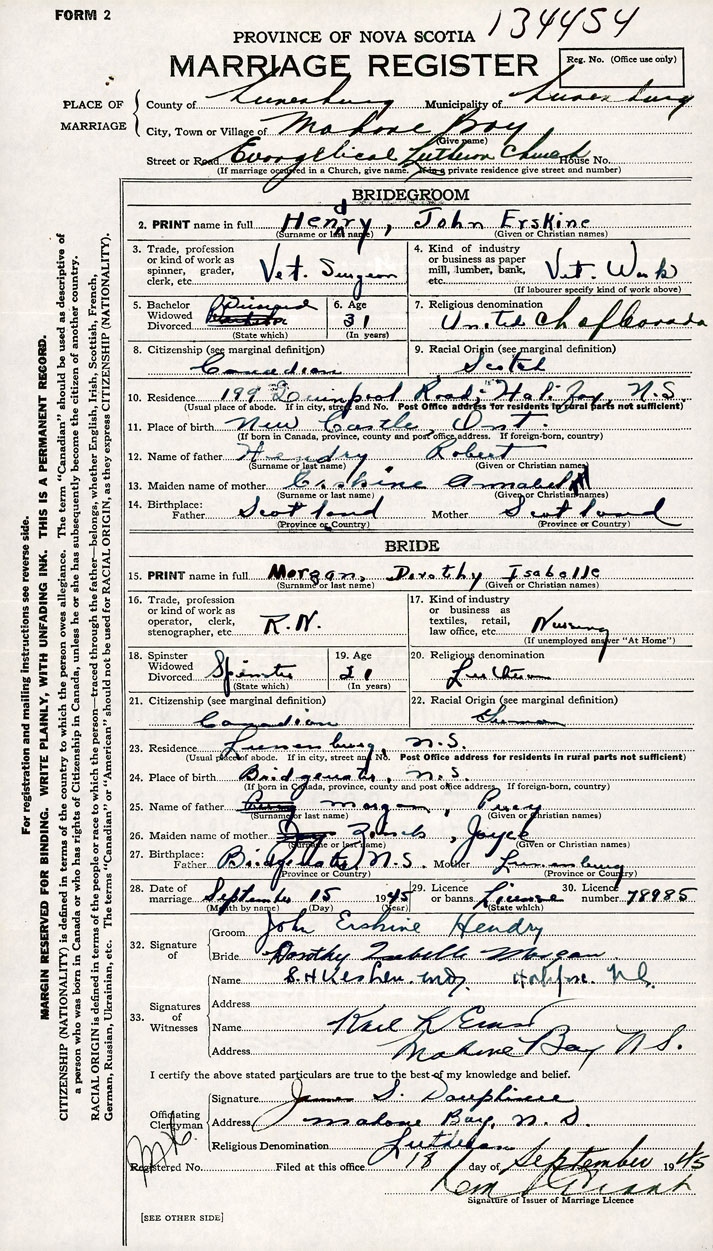 PLACE OF MARRIAGE County of Lunenburg in City or Town Mahone Bay
