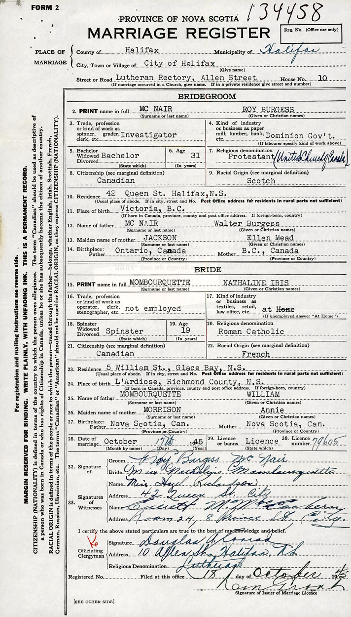 According to a certified copy of the Decree Absolute for Divorce dated 1969-9-19 and filed in the Office of the Registrar General under Divorce number 69-001810, it is ordered that the marriage of Roy Burgess McNair and Nathaline Iris Mombourquette (Registered under marriage number 1945-134458) be null and void.