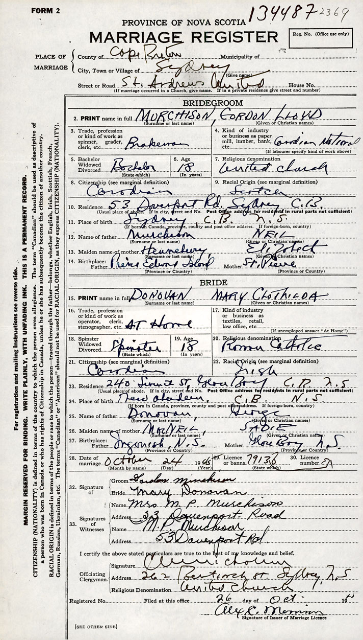 26. Place of marriage St. Andrew's Church Sydney, Cape Breton County