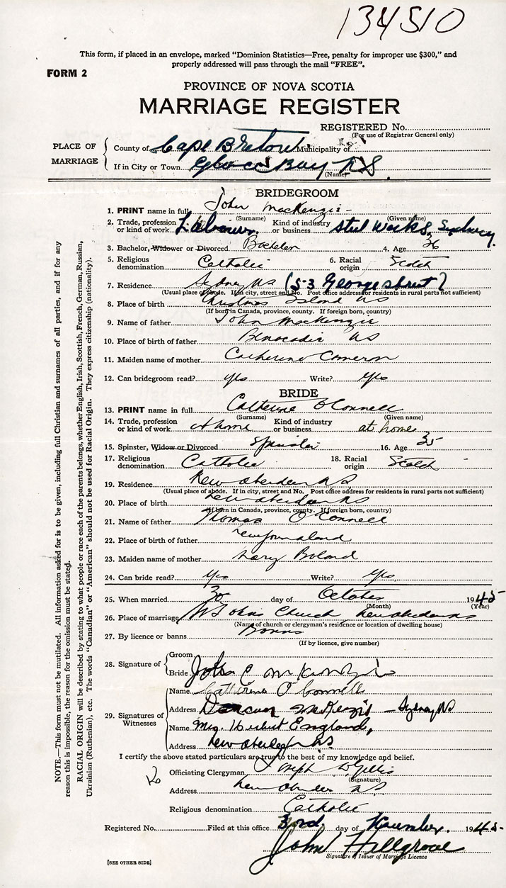 PLACE OF MARRIAGE County of Cape Breton in City or Town New Aberdeen, Glace Bay