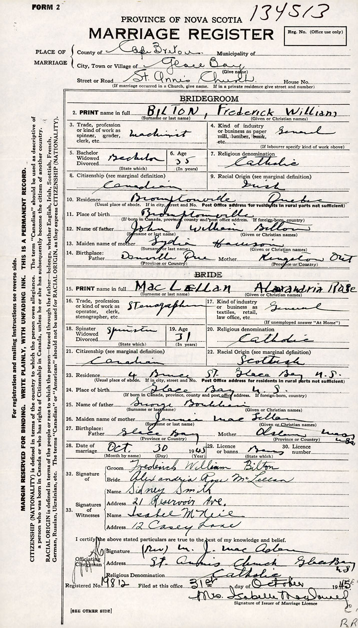 PLACE OF MARRIAGE County of Cape Breton in City or Town Glace Bay