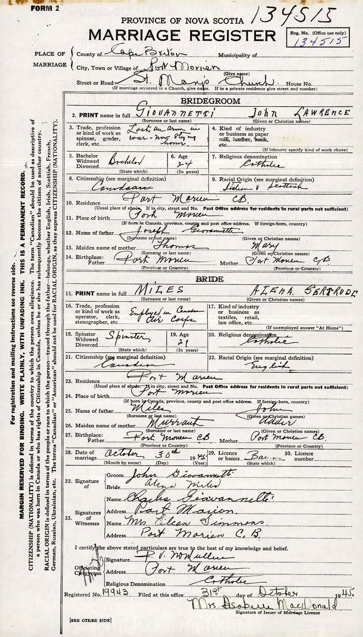 PLACE OF MARRIAGE County of Cape Breton in City or Town Port Morien