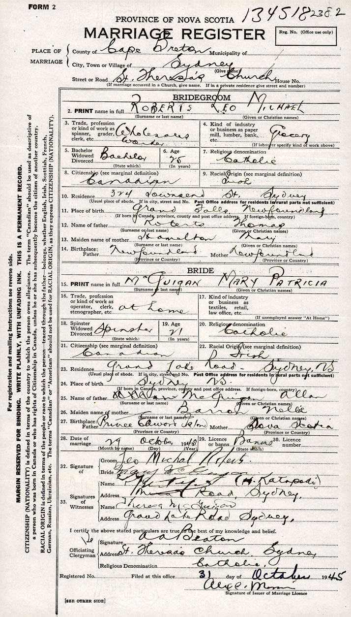 26. Place of marriage St. Theresa's Church Sydney, Cape Breton County