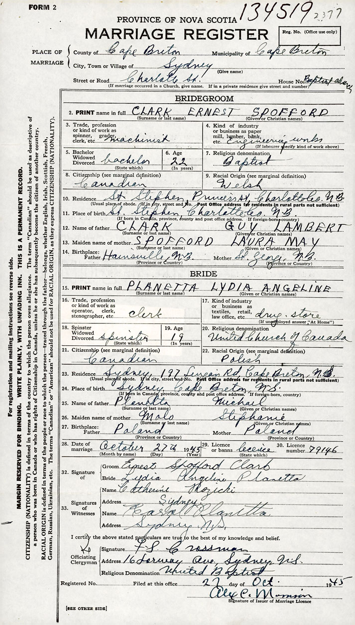 Note: Groom's mother born St. George, NB; bride's mother born Poland. Name of 2nd witness uncertain.