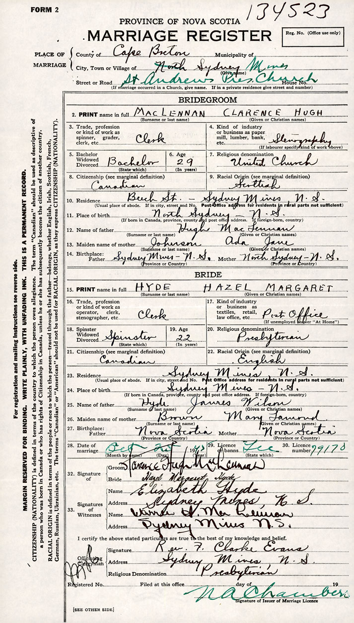 Note: Groom's mother born North Sydney; bride's mother born Nova Scotia