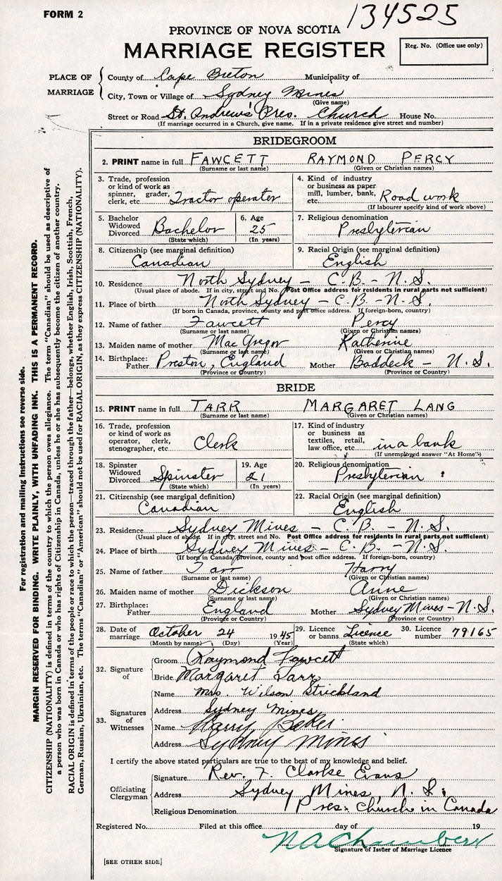 26. Place of marriage St. Andrew's Presbyterian Church Sydney Mines, Cape Breton County