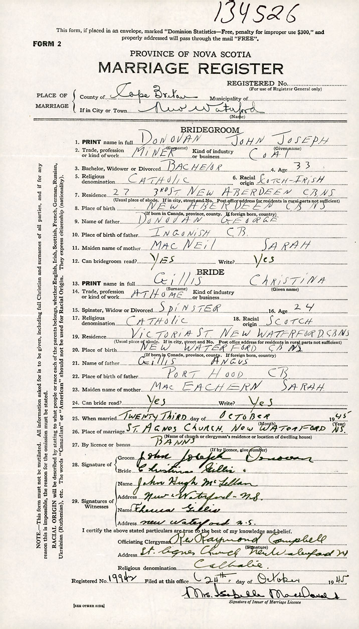 PLACE OF MARRIAGE County of Cape Breton in City or Town New Waterford