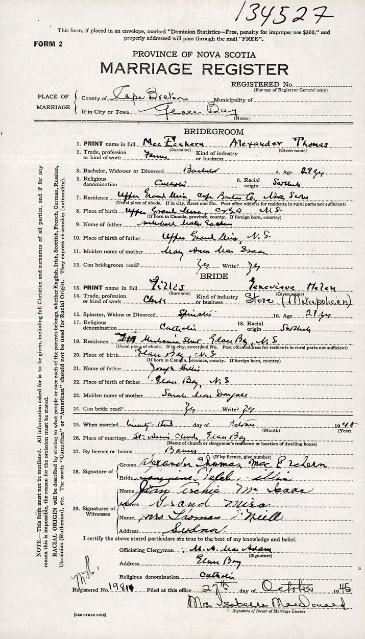 PLACE OF MARRIAGE County of Cape Breton in City or Town Glace Bay