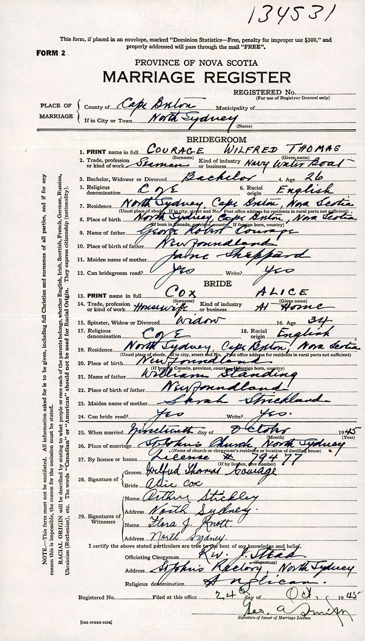 26. Place of marriage St. John's Church North Sydney, Cape Breton County