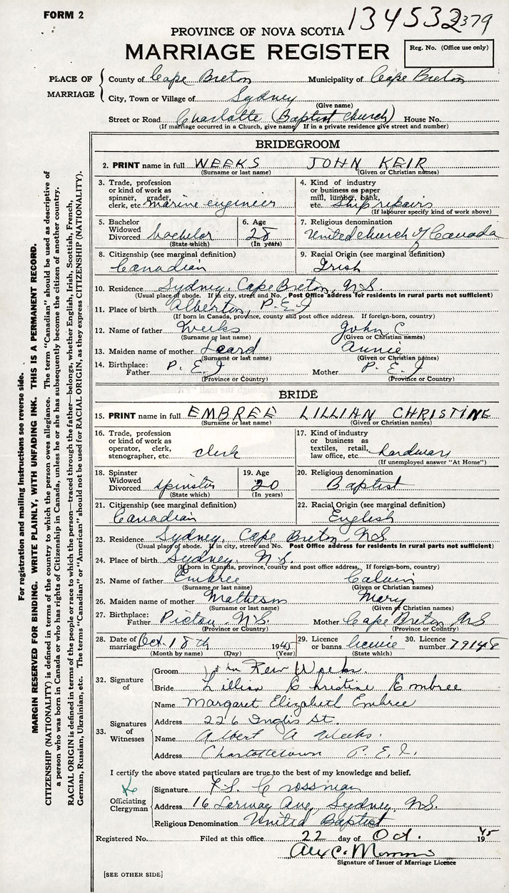 Note: Groom's mother born PEI; bride's mother born Cape Breton