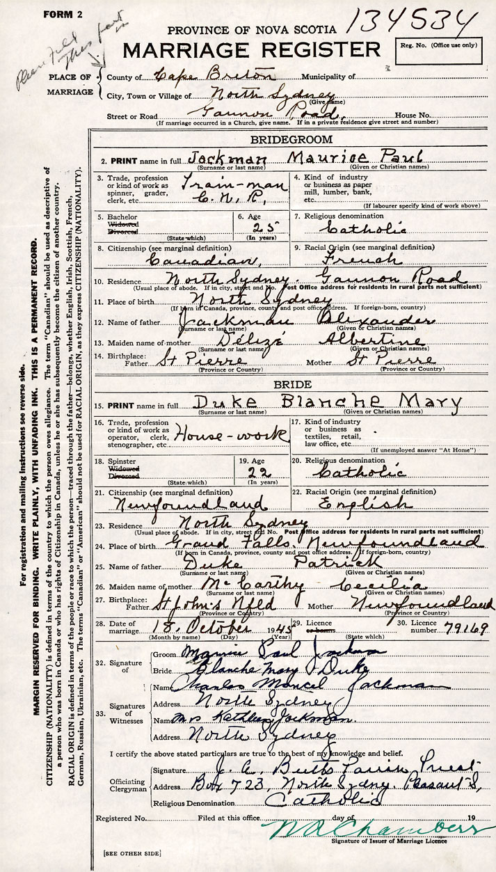 Note: groom's mother born St. Pierre; bride's mother born Newfoundland
