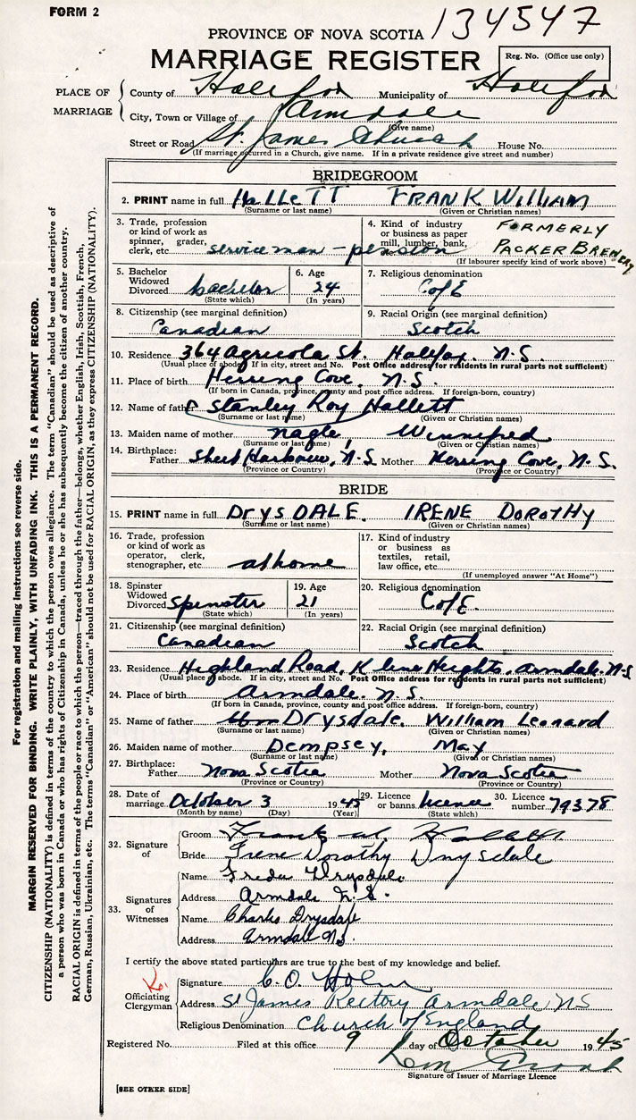PLACE OF MARRIAGE County of Halifax in City or Town Armdale