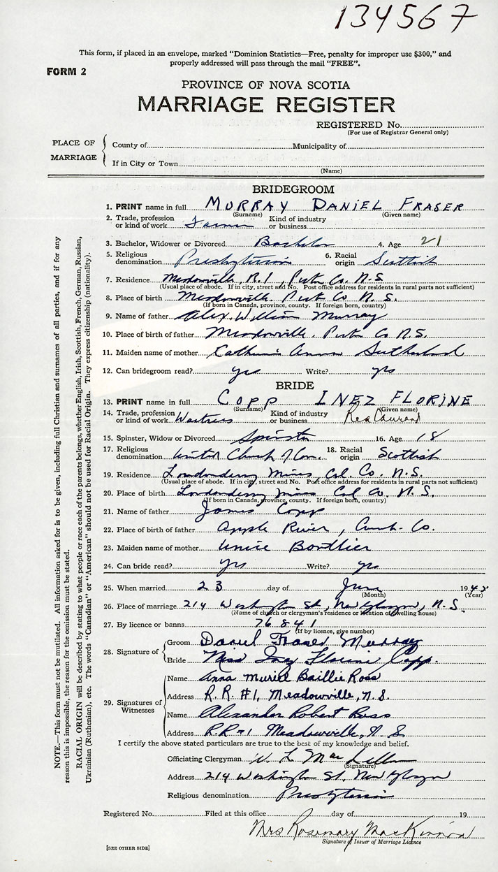 26. Place of marriage 214 Washington St. New Glasgow, Pictou County