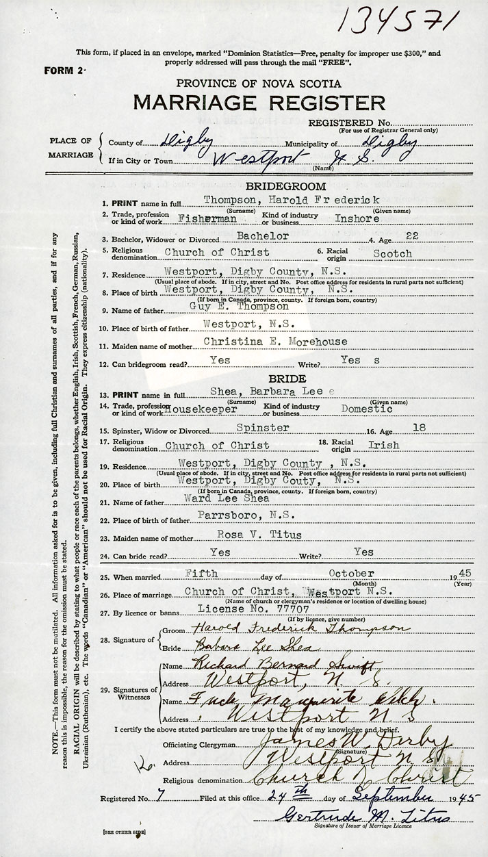 26. Place of marriage Church of Christ Westport, Digby County