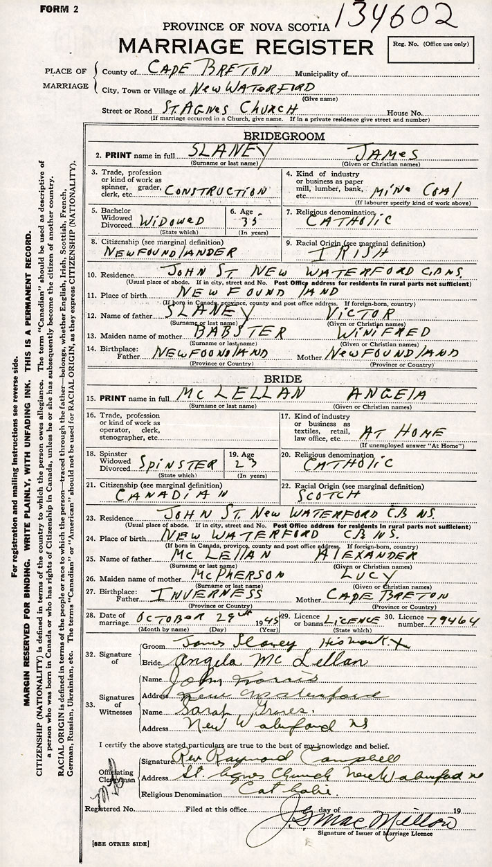 Note: Groom's mother born Newfoundland; bride's mother born Cape Breton