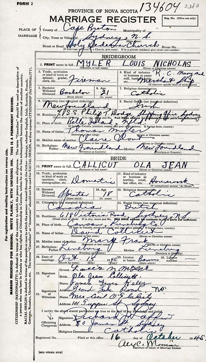 Note: Groom's mother from Newfoundland; bride's mother born Lunenburg