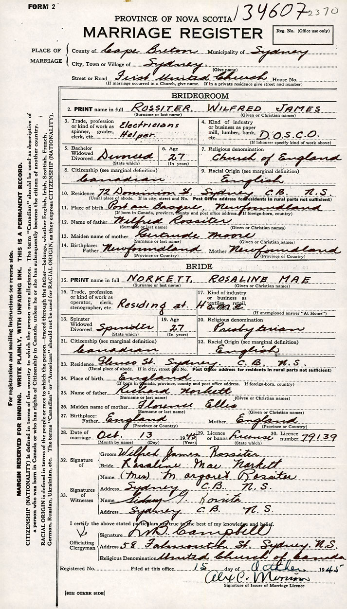 PLACE OF MARRIAGE County of Cape Breton in City or Town Sydney