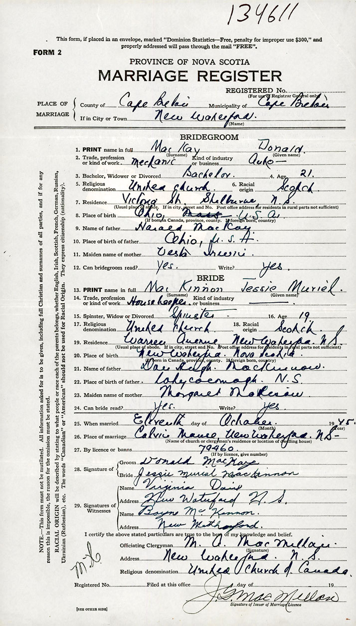 5. Religious denomination United Church of Canada 6. Racial origin Scotch