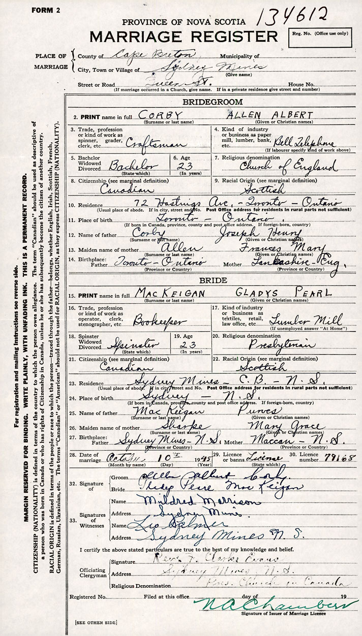 26. Place of marriage Queen Street Sydney Mines, Cape Breton County